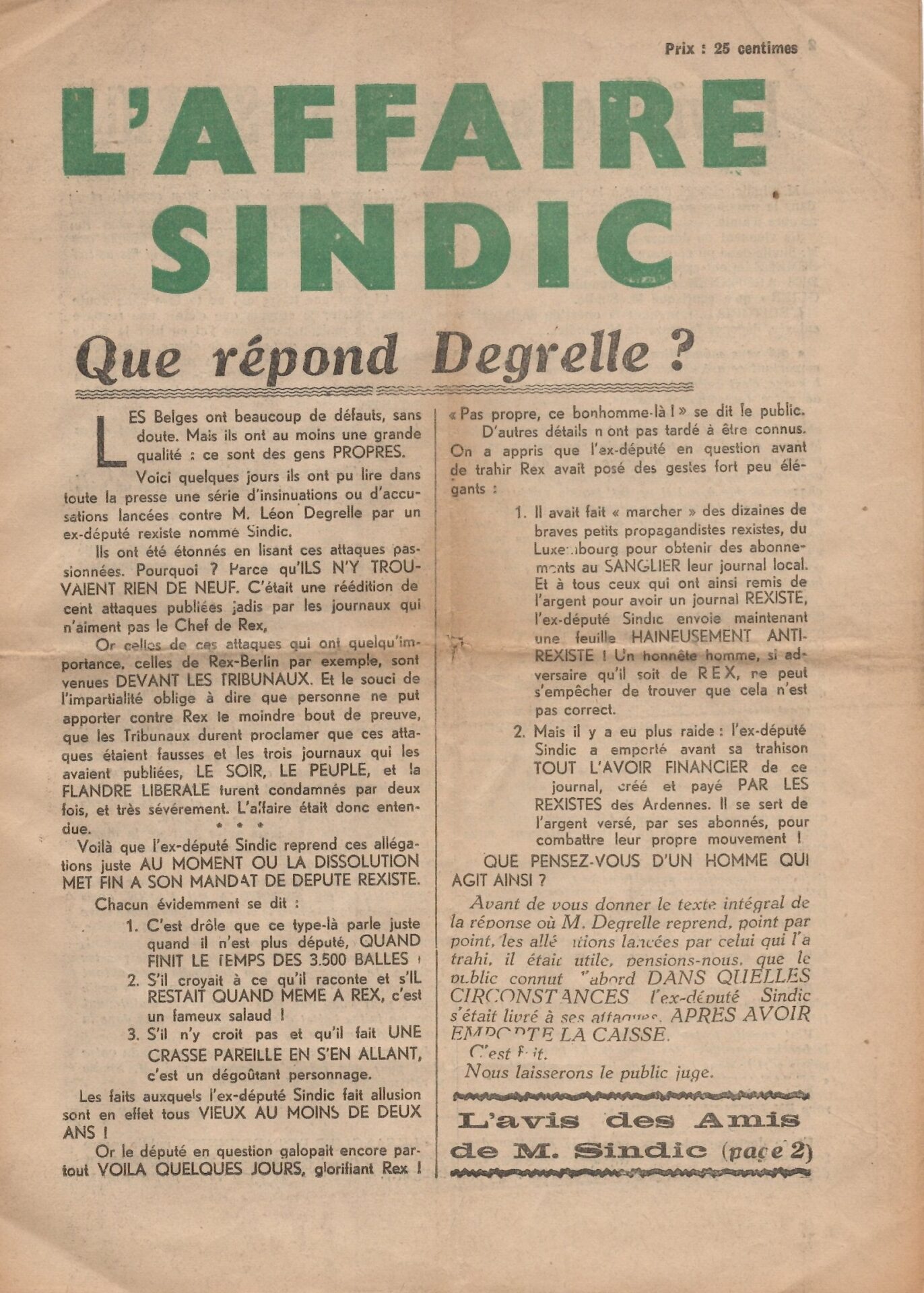 Léon Degrelle répond aux accusations de Raphaël Sindic affirmant que celles-ci sont colportées par les adversaires de Rex depuis longtemps. Au sein d’une publication de huit pages diffusée par Rex et intitulée L’affaire Sindic. Que répond Degrelle ?, il est écrit : « Or celles de ces attaques qui ont quelqu’importance, celles de Rex-Berlin [affirmant que Rex aurait entretenu des contacts avec l’Allemagne] par exemple, sont venues devant les tribunaux. Et le souci de l’impartialité oblige à dire que personne ne put apporter contre Rex le moindre bout de preuve, que les tribunaux durent proclamer que ces attaques étaient fausses et que les trois journaux qui les avaient publiées, Le Soir, Le Peuple et La Flandre libérale, furent condamnés par deux fois, et très sévèrement. L’affaire était donc entendue. » Il lui reproche également de quitter Rex juste quand son mandat de député se termine, d’utiliser un organe de presse rexiste, Le Sanglier, afin d’attaquer Rex, ainsi que d’être instable psychologiquement. Raphaël Sindic porte plainte contre Léon Degrelle pour diffamation. Lors de la campagne pour les élections législatives de 1939, Raphaël Sindic prend position contre Rex et publie des articles anti-degrelliens dans Le Sanglier. Rex recule fortement à l’issue du scrutin.